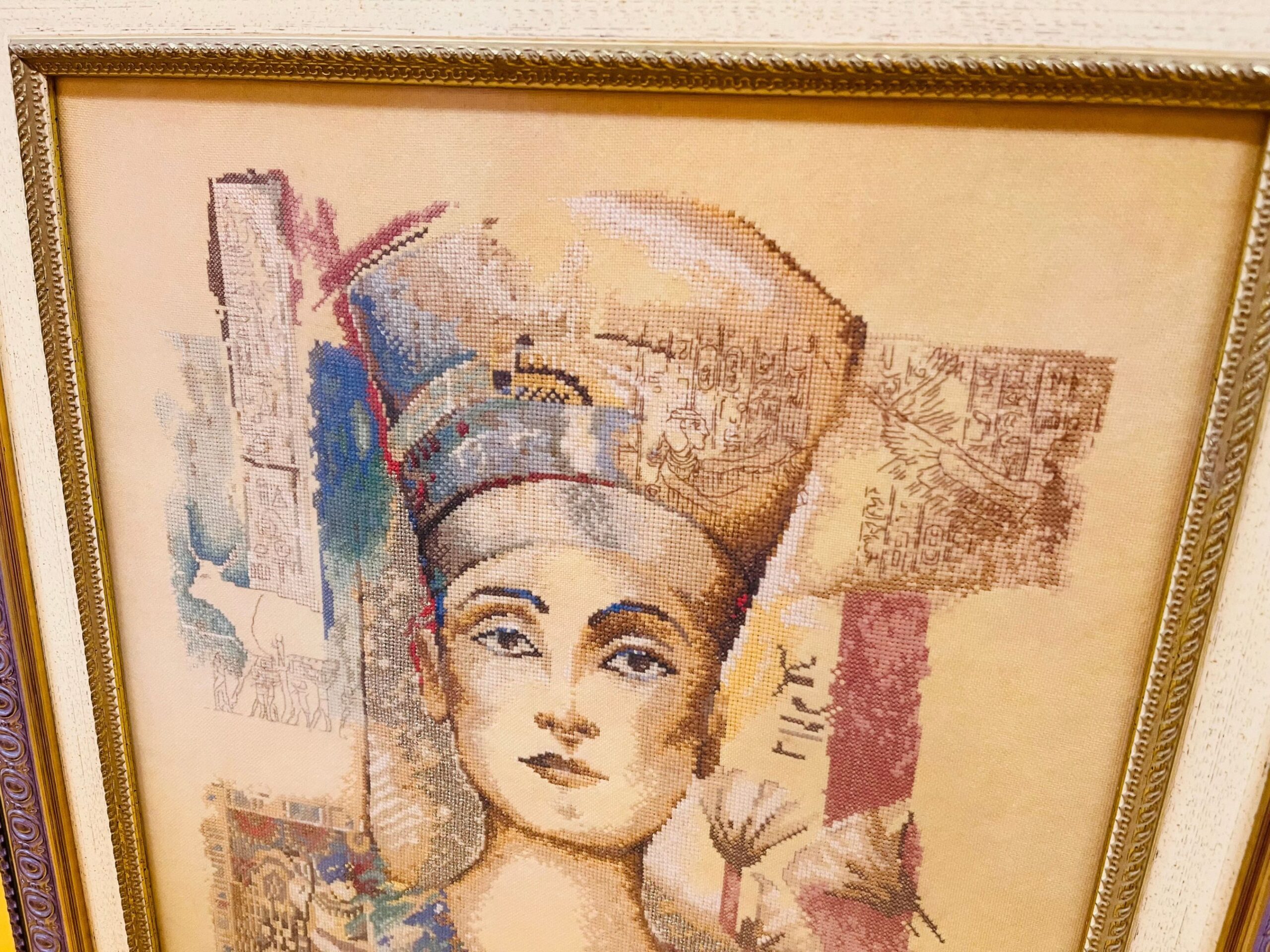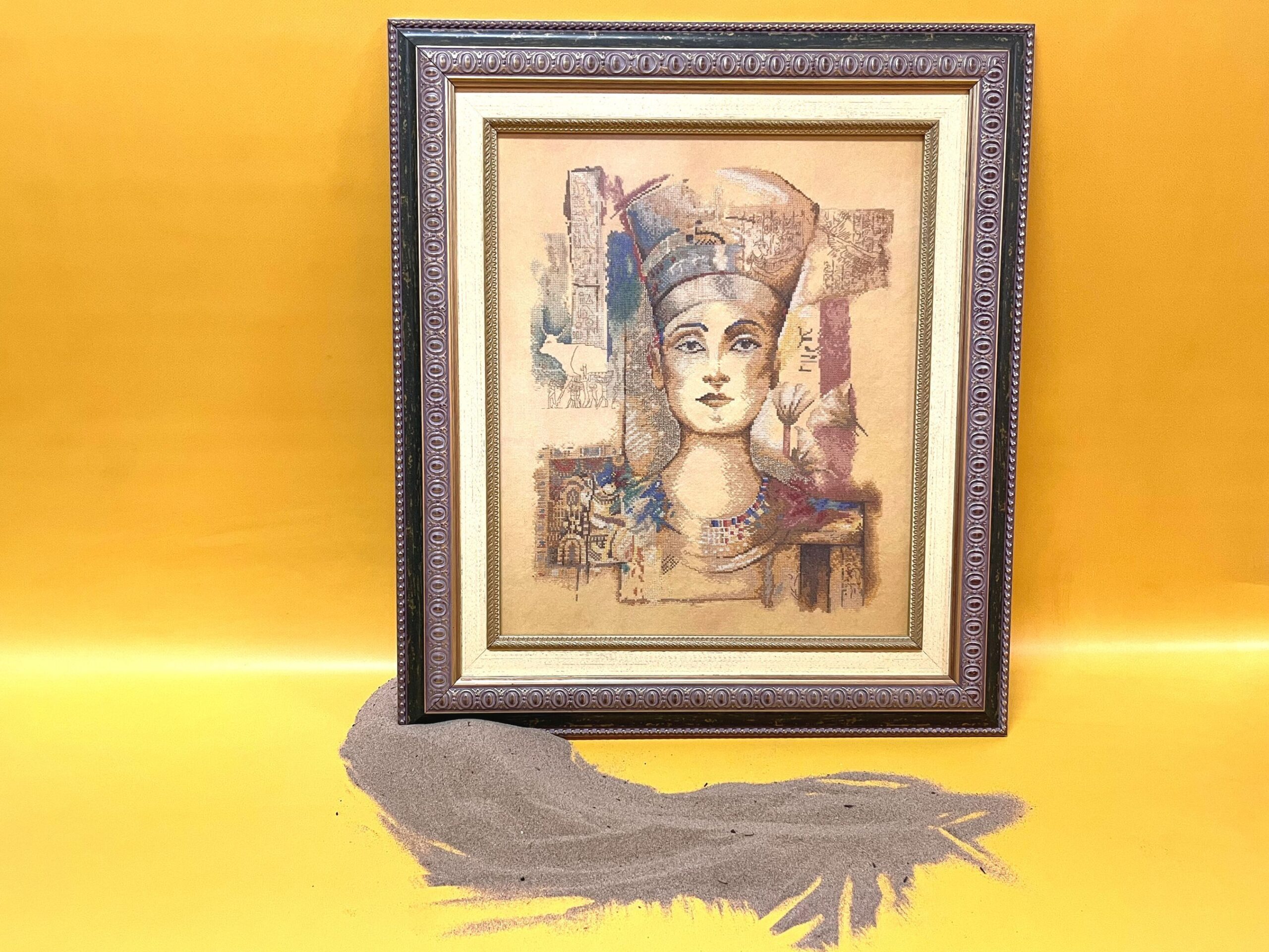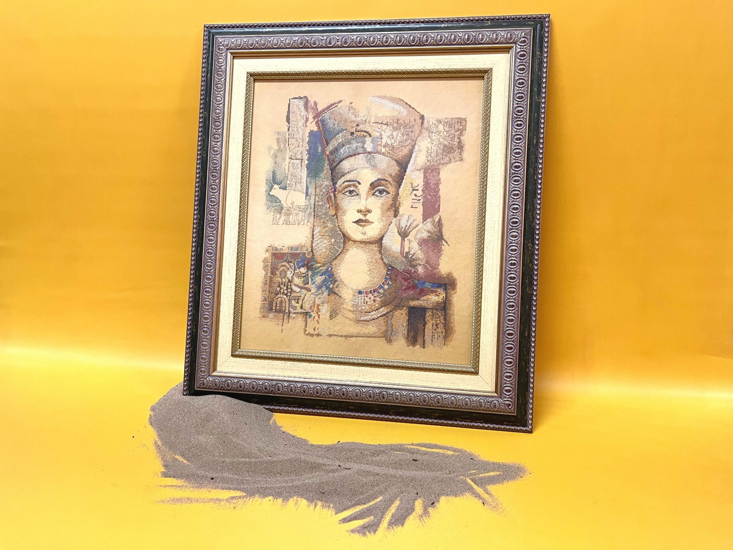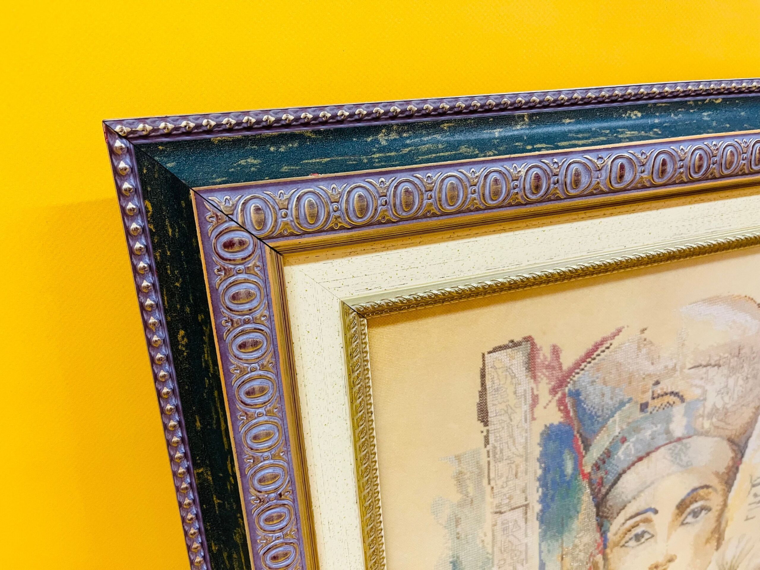 This Ashtoning wall hanging features an Egyptian painting, showcasing a stunning knitted Pharaoh image. This unique art piece will instantly elevate any wall, whether it’s in your home, living room, bedroom, or as an entryway decor. Framed with a dark green border, an inner beige frame, and a golden stroke, it adds a touch of elegance.