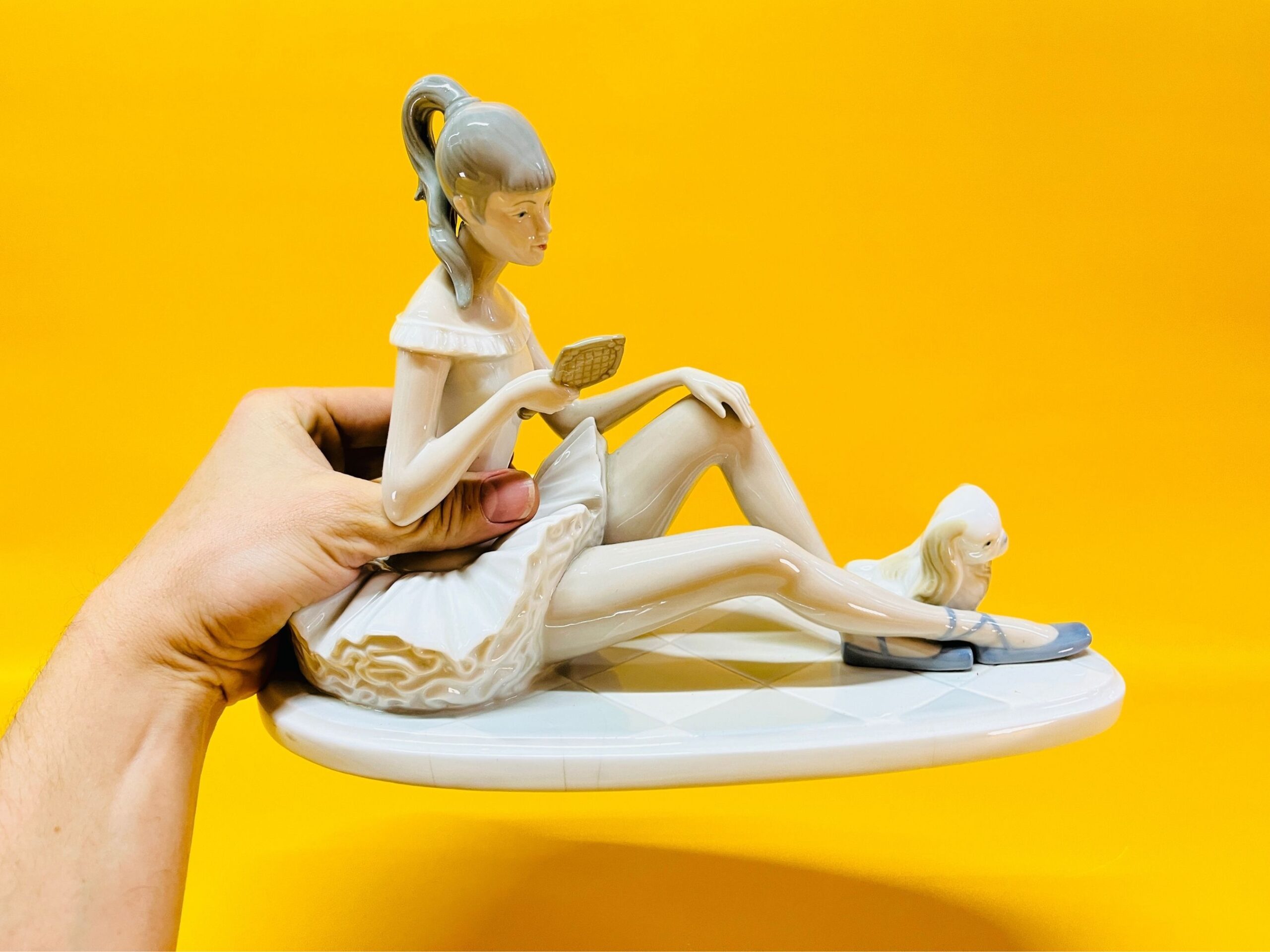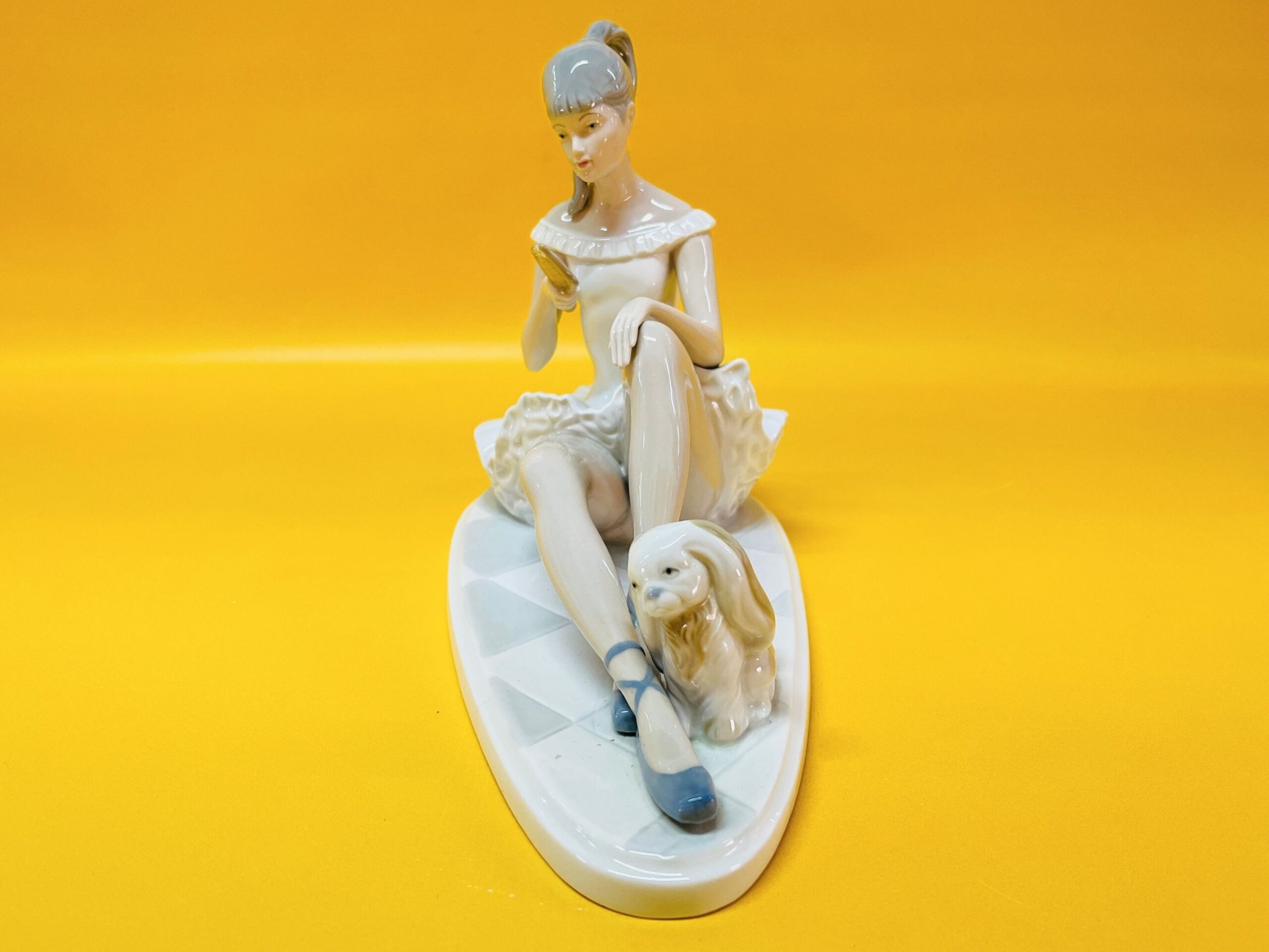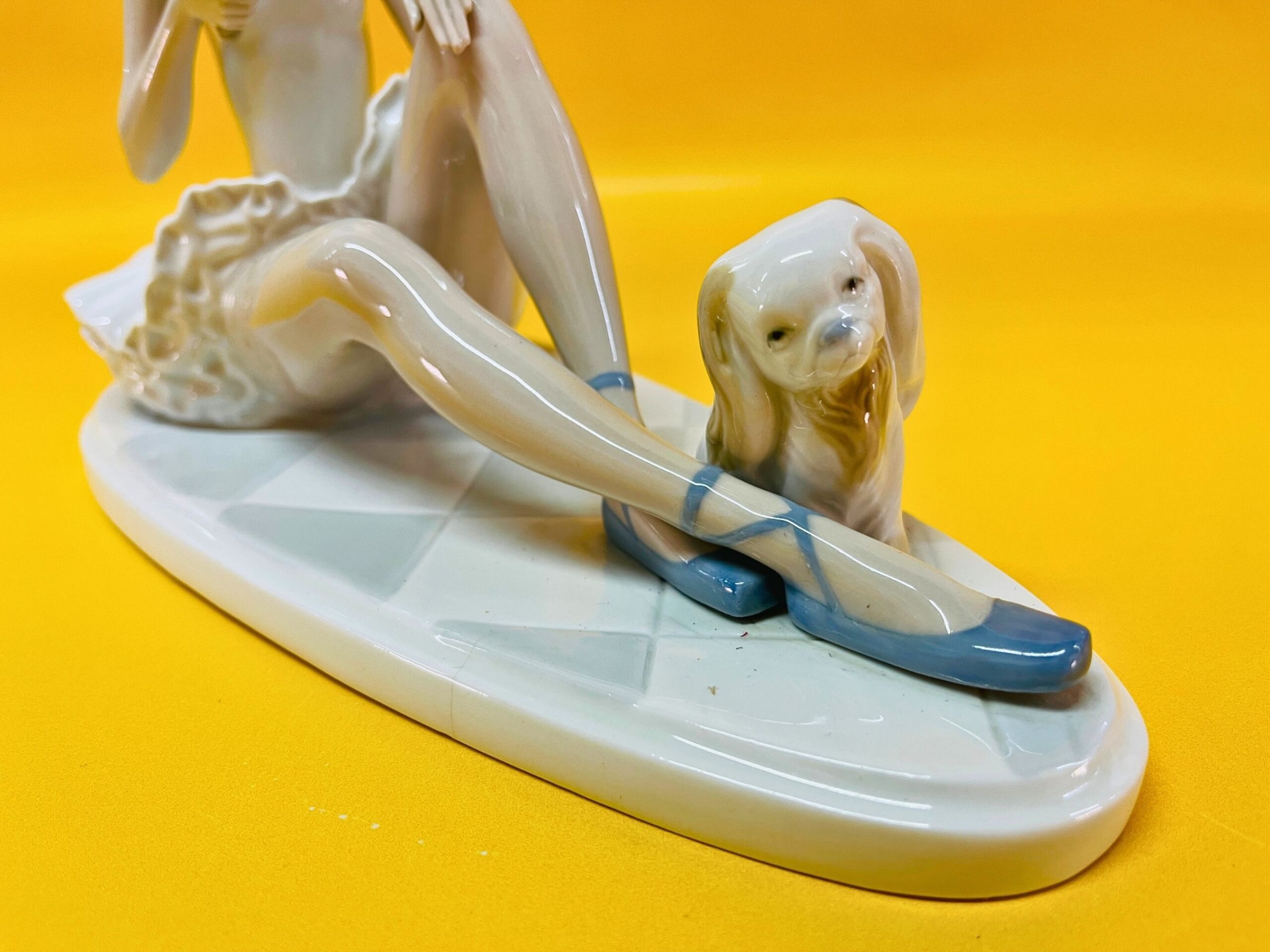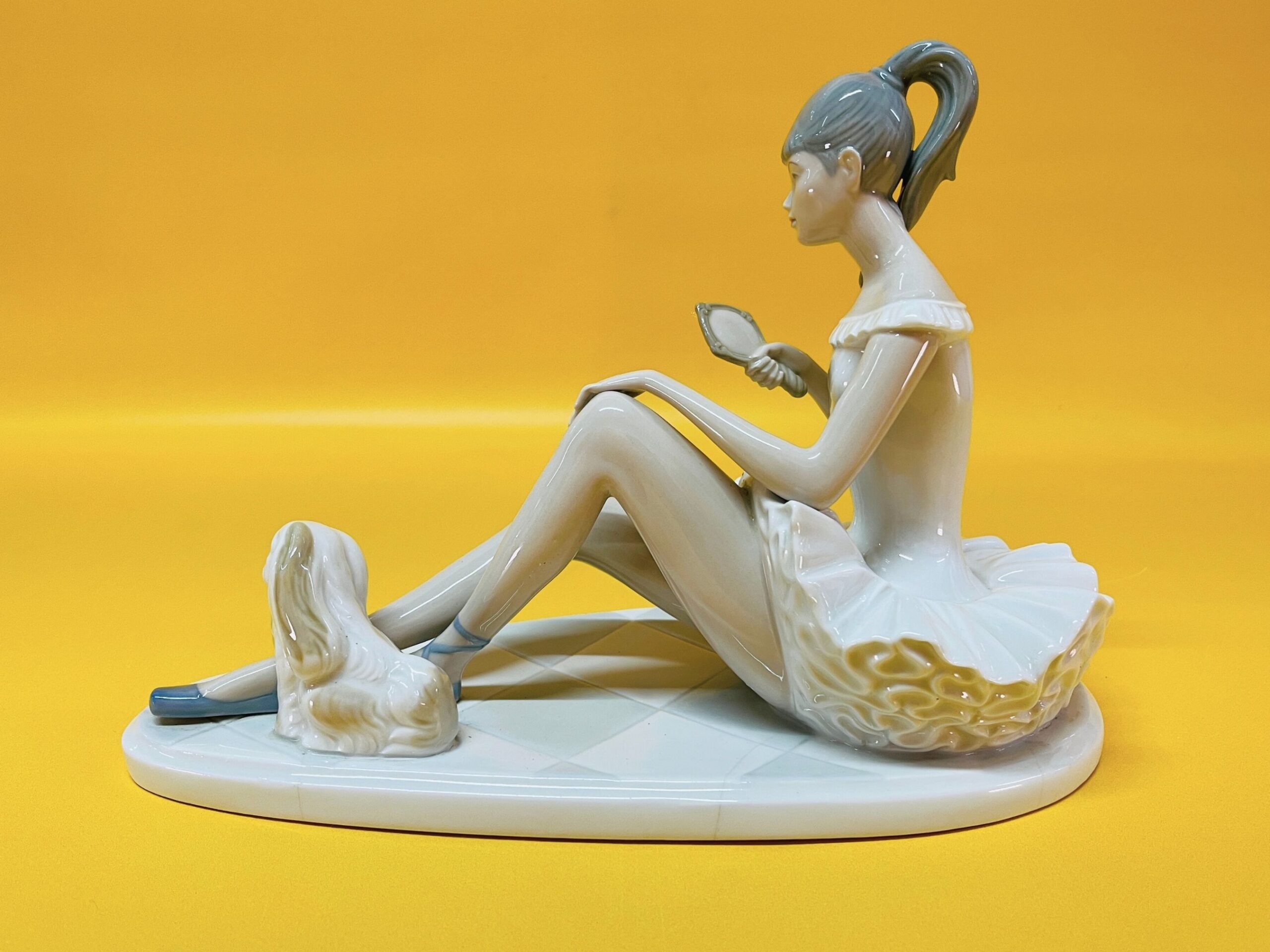 This elegant porcelain figurine by Miquel Requena features a graceful ballerina girl admiring herself in a mirror, accompanied by a small dog. Handmade in Spain, it reflects the fine craftsmanship and delicate detail typical of Requena’s work from the 1970s–1980s.