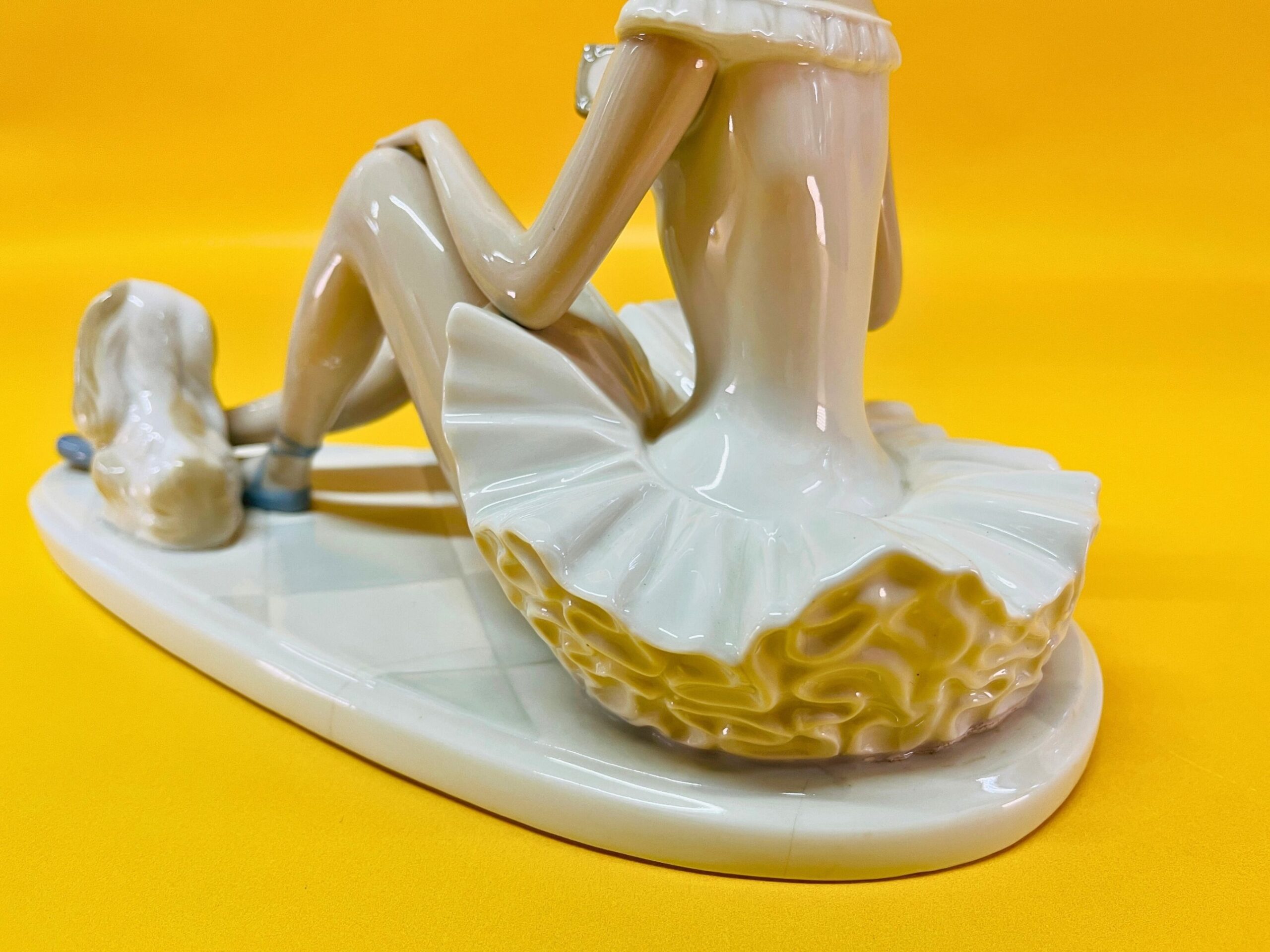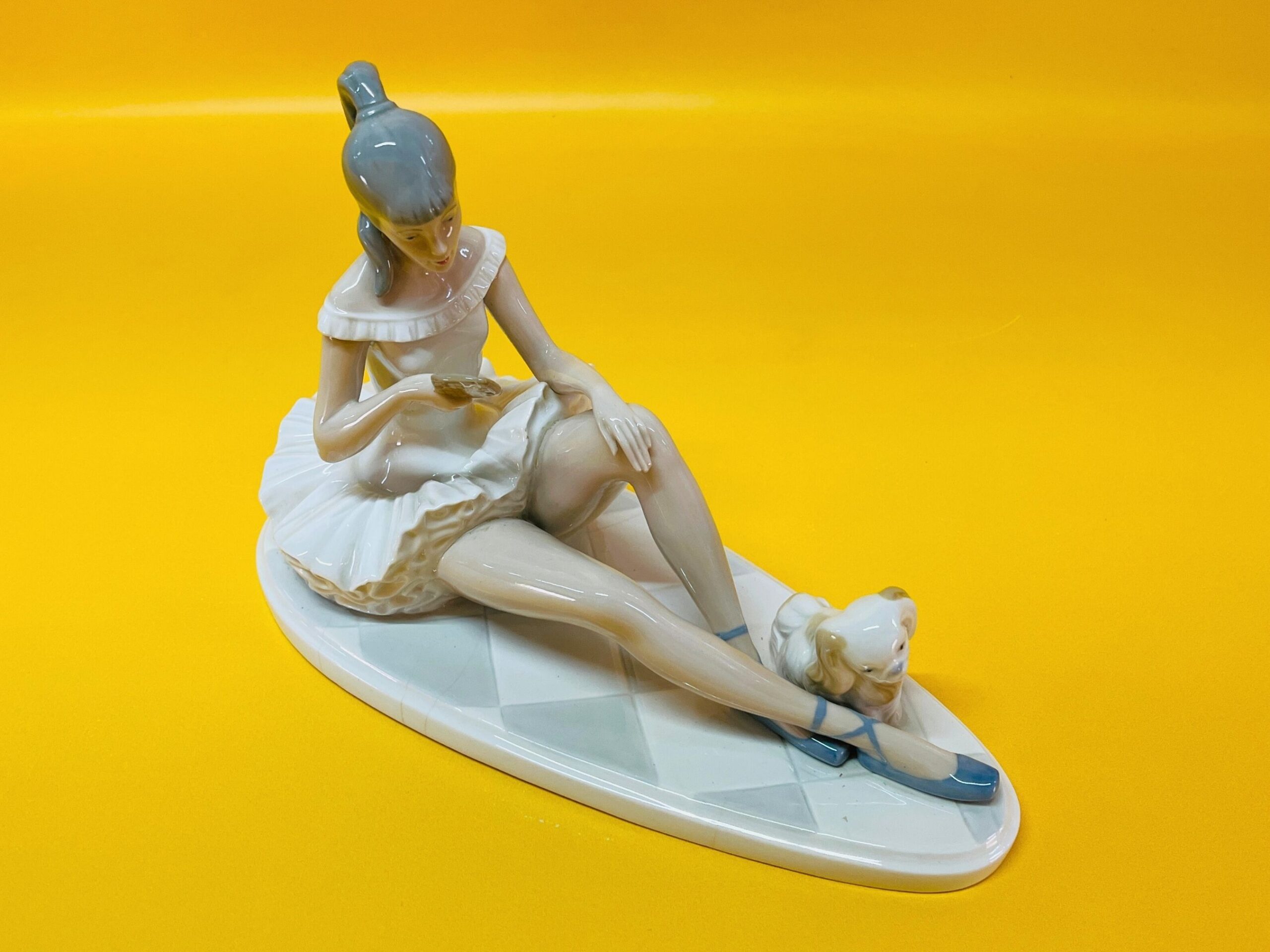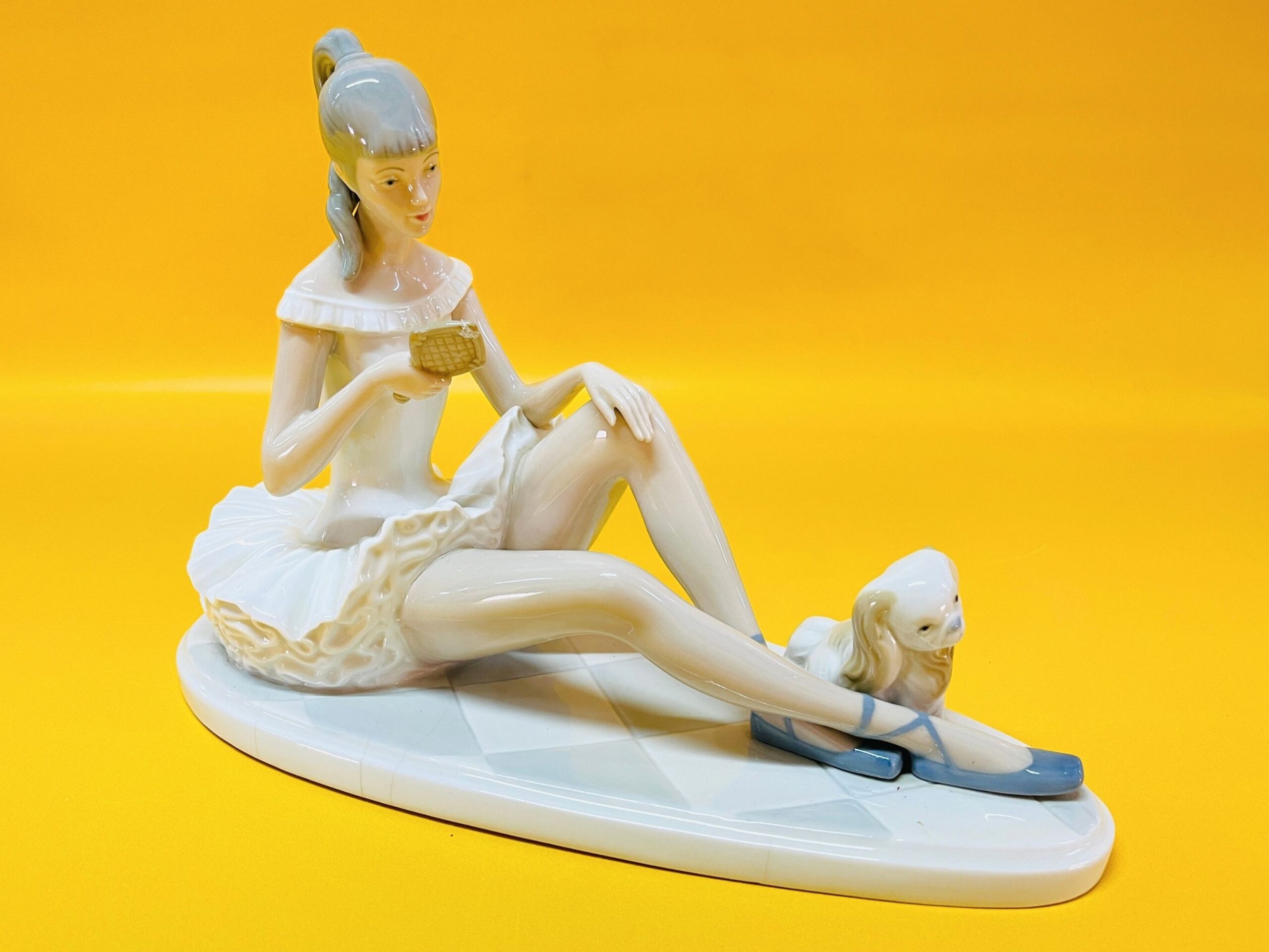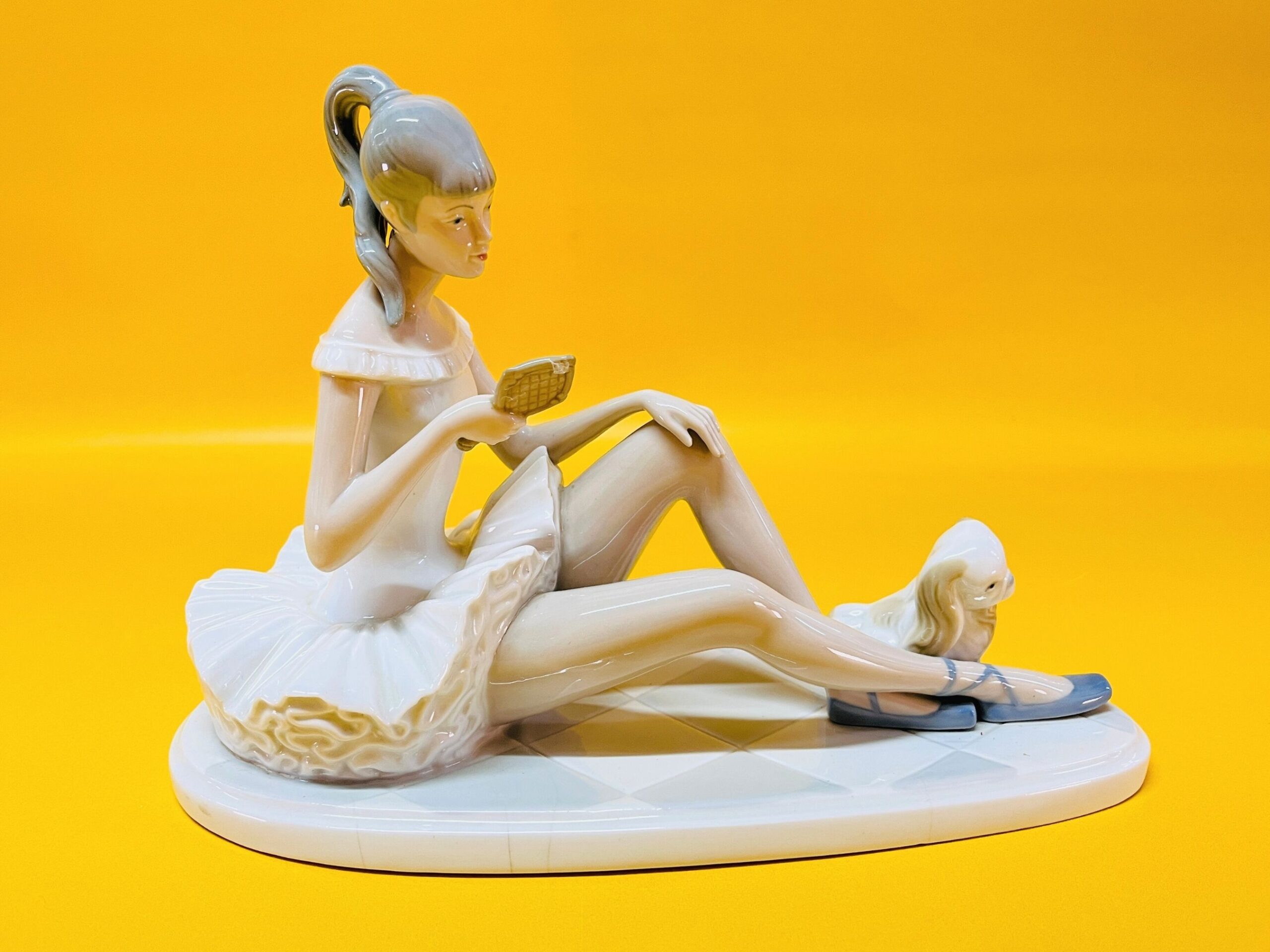 This elegant porcelain figurine by Miquel Requena features a graceful ballerina girl admiring herself in a mirror, accompanied by a small dog. Handmade in Spain, it reflects the fine craftsmanship and delicate detail typical of Requena’s work from the 1970s–1980s.