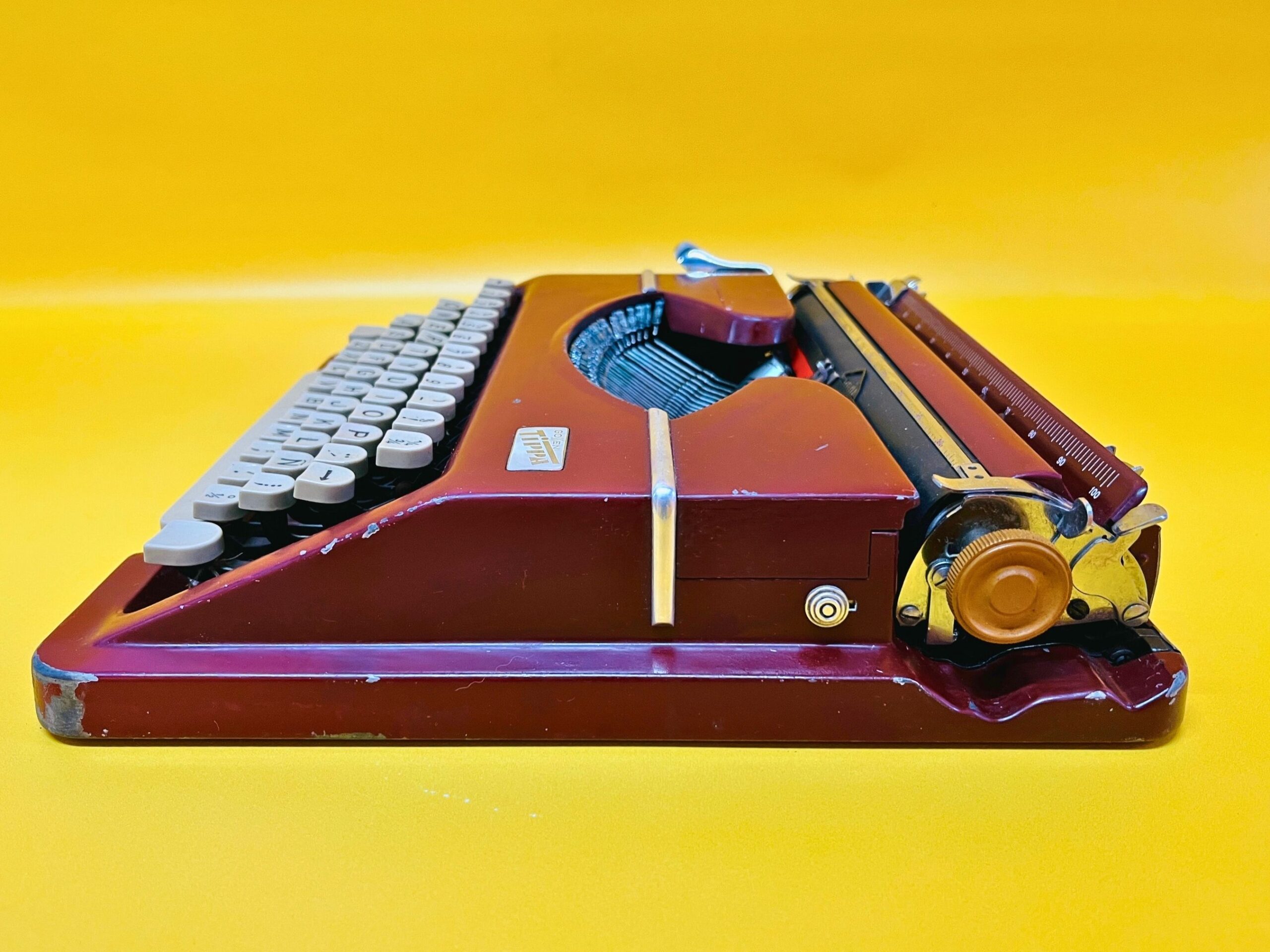 Experience the craftsmanship of German engineering with this Gossen Tippa typewriter. Manufactured in West Germany, this ultra-portable typewriter is lightweight and smooth, making it perfect for writers on the go. The maroon-red color adds a vintage charm, while its reliability makes it both a functional tool and a statement piece.